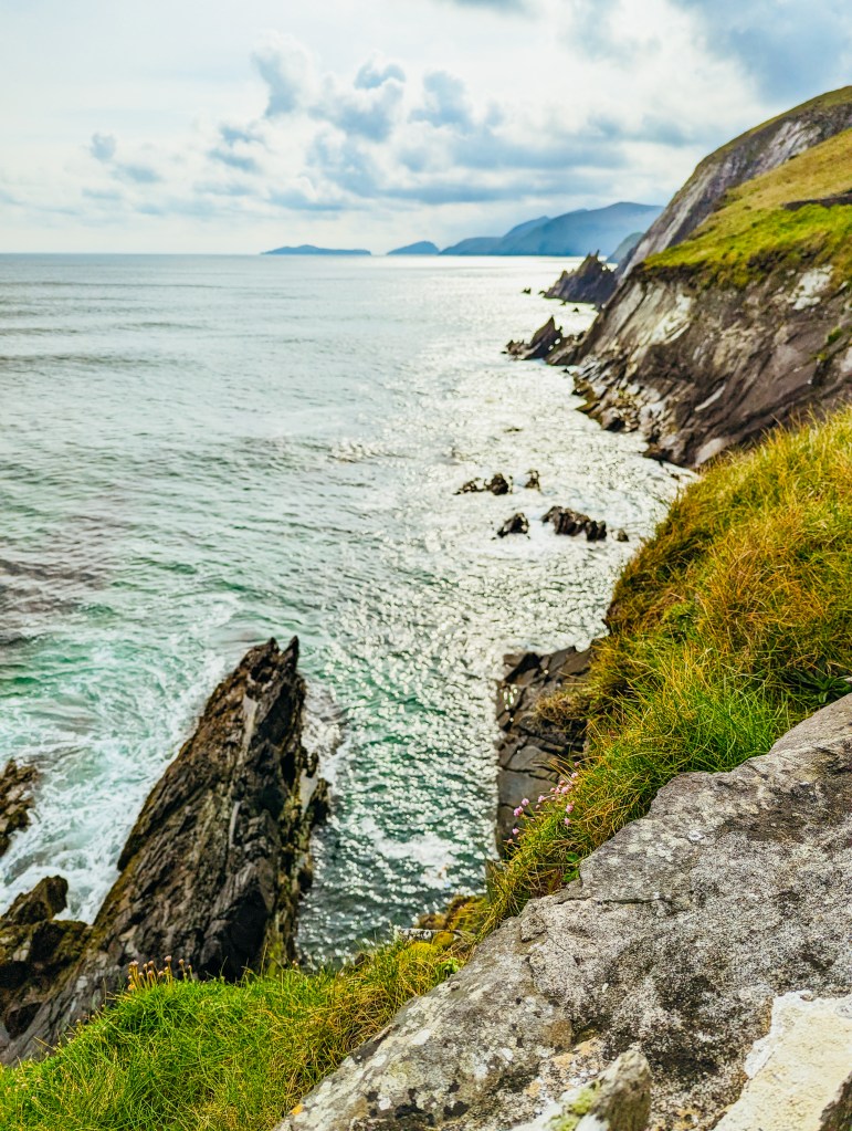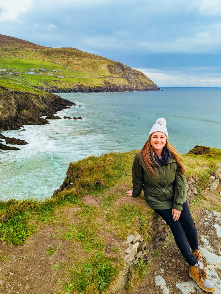 A little further up the road are more beehive huts called “The Last Beehive Huts”. I spoke with the owner and he told me that Star Wars came and scanned a few of the huts to use as models for creating several huts they used in the films. These huts are so impressive to see in person. They were all constructed by tightly stacking rocks to form the huts, without mortar or anything else holding them together. Also, at this location it is the perfect opportunity to hold some lamb babies. Growing up my grandparents had lots of sheep and baby lambs, getting to hold these sweet little babies reminded me of my childhood and many memories of bottle feeding the little lambs. It was a fun photo-op moment and they were all so cute, soft and snuggly. We ended our Slea Head tour at Dunmore Head and a walk along the hillside where we admired beautiful scenic views that stretched across the ocean with several islands off in the distance.