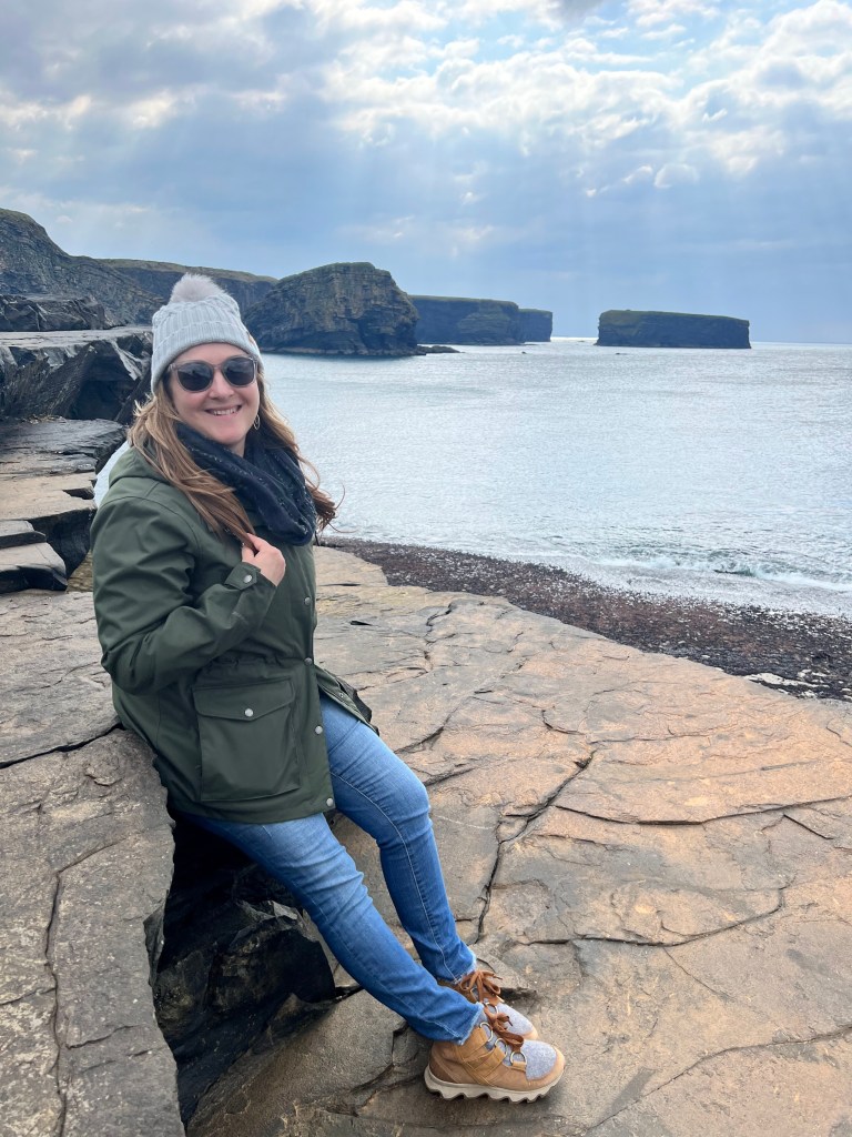 Wind whiped through my hair and across the grassy plains, whistled through the rocks, waves crashed againsted the rugged rocky cliffs and we sat for hours completely mesmerized by the majestic view. Walking on the edge of these breathtaking cliffs is a thrilling adventure you have to experience at least once in your life to truly appreciate the granduer, scale & impressive heights of them. At one point the breeze was so strong it nearly ripped my stocking cap off my head & made the little fluffy bauble at the end stand straight out. My friends all thought it was hilarious because apparently I reminded them of a little garden gnome when my hat was standing at a point …*See photo below of my gnome hat 😉