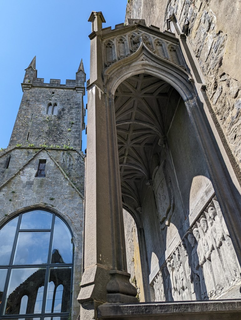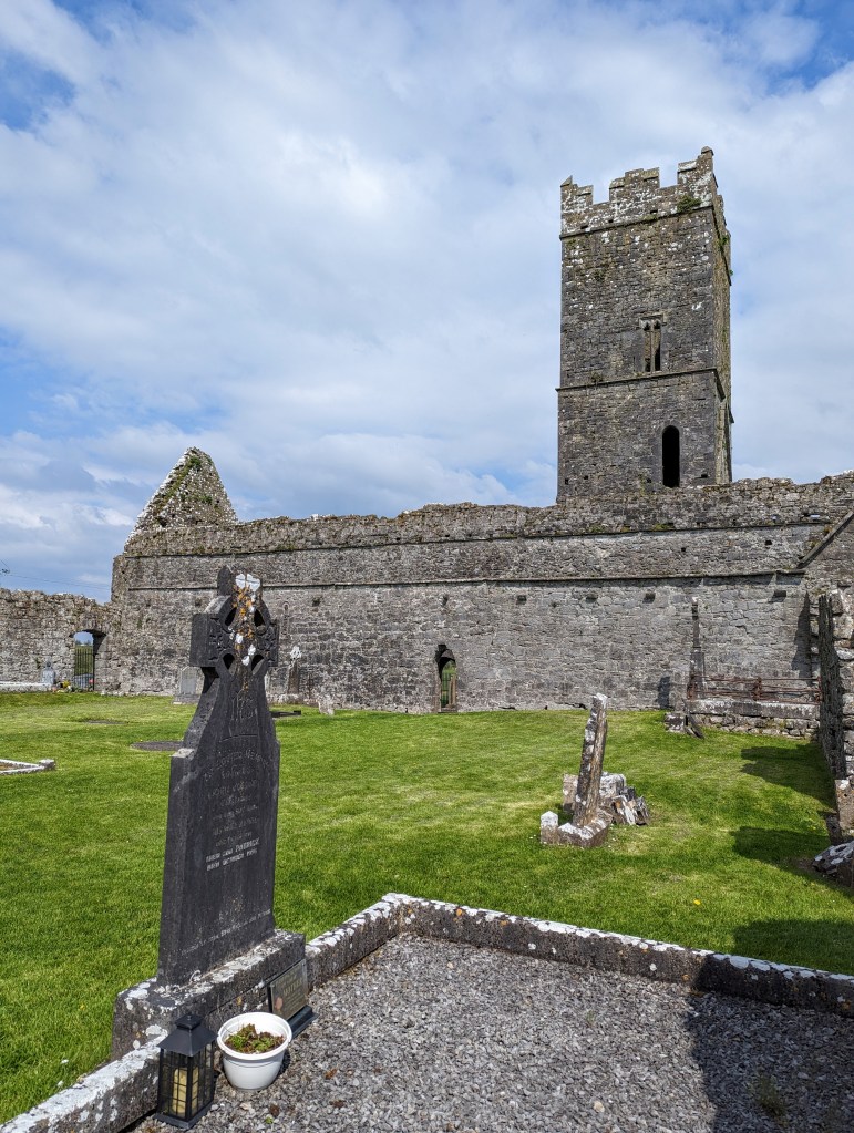 Our next stop was Clare Abbey, located in the city of Ennis. Clare Abbey is a ruined Augustinian monastery founded in 1189 along the banks of the Fergus River. With extensive ruins and unique architecture it was a very interesting site to visit. The monestary was under the patronage of Donal Mor O’Brien, King of Munster and eventually grew to become the most important and powerful in the diocese. The beautiful ruins that exist today consist of a long nave, chancel church and tower, domestic buildings and cloisters that surround the church. When we arrived we parked in the small car park and walked across the stone precipice to the innards of the ruins and had the entire place to ourselves for over an hour. The sunlight glistened through the 15th century traceried windows, crows circled overhead and we marveled at the ornate architectural details. Chico had brought a drone along on the trip and had a great time capturing stunning overhead views, however, the crows weren’t to fond of the drone and chased it for a bit. ; )