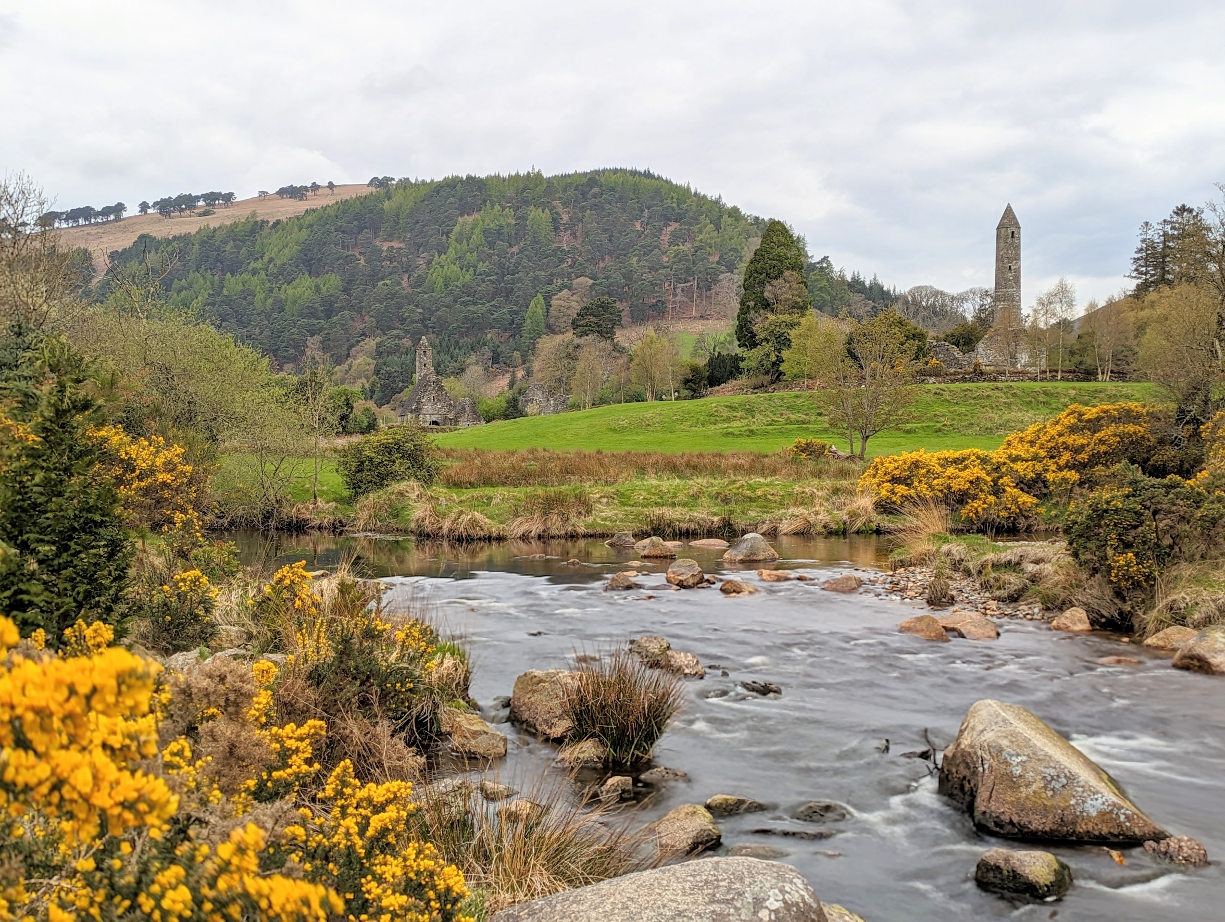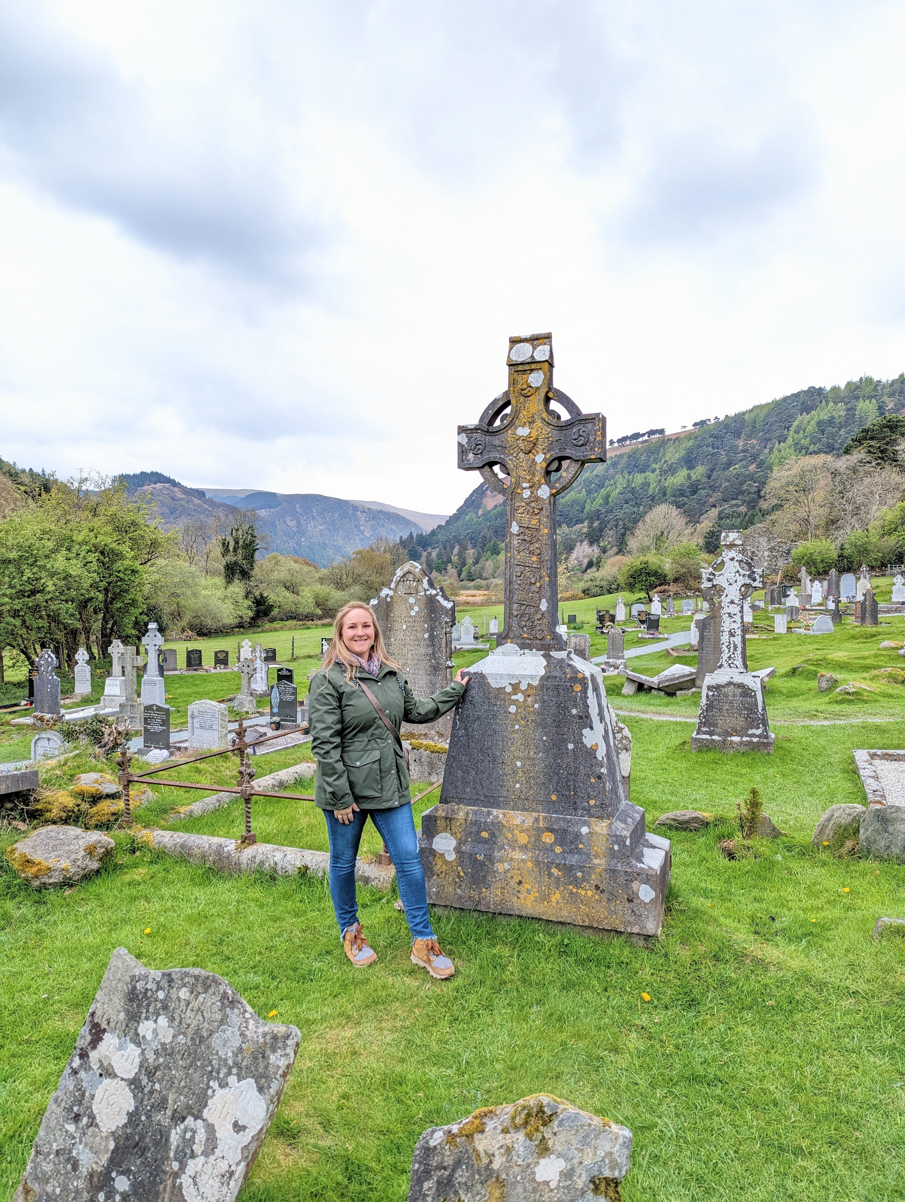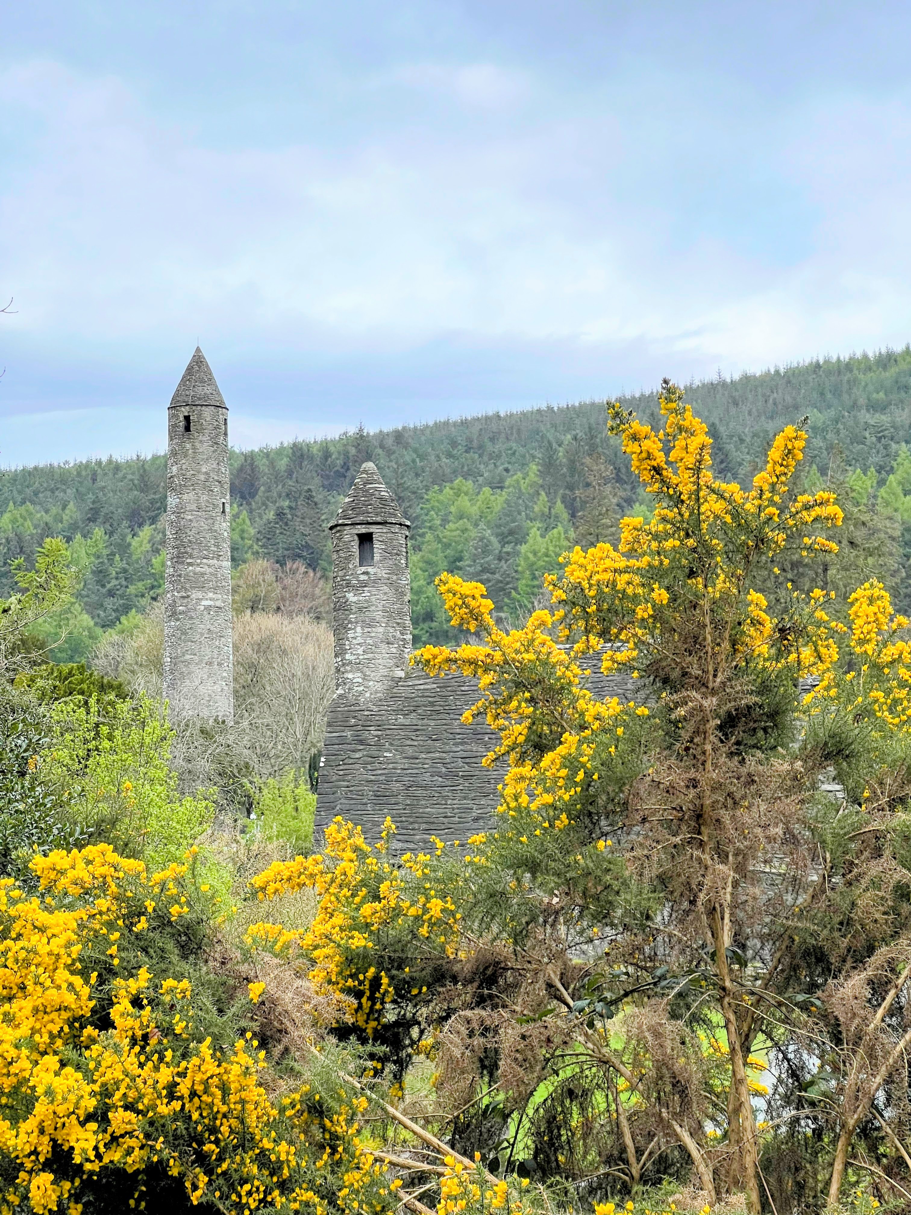 At the end of our tour we stopped in the gift shop and at the cafe for a quick bite before heading south to our next destination, the Monastic City of Glendalough (pronounced Glen-da-lock). It was a beautiful 40 minute drive through the Wicklow National Forest & national park on our way to Glendalough. Once we arrived we walked to the Monastic City, which are 9th & 10th century ruins consisting of a round tower, St. Kevins Chapel, St. Mary’s Church, the priest’s house, the cathedral and a cemetary. The city was built between the 10th and 12th century with several of the crosses in the cemetary dating to the 6th century. One of the guides told me that the intricate details carved into cross grave markers were added to share the salvation story with the Irish people who were mostly illiterate at the time. It was interesting to see all of the details that have stood the test of time and are still very present even after centuries of being exposed to the harsh elements of an Irish winter. The setting couldn’t have been lovelier for the Monastic city, nestled in the foothills of the Wicklow Mountains, between a babbling brook and the upper & lower Glendalough lakes. The view is straight out of a storybook, complete with woodland creatures and scenic views in every direction!