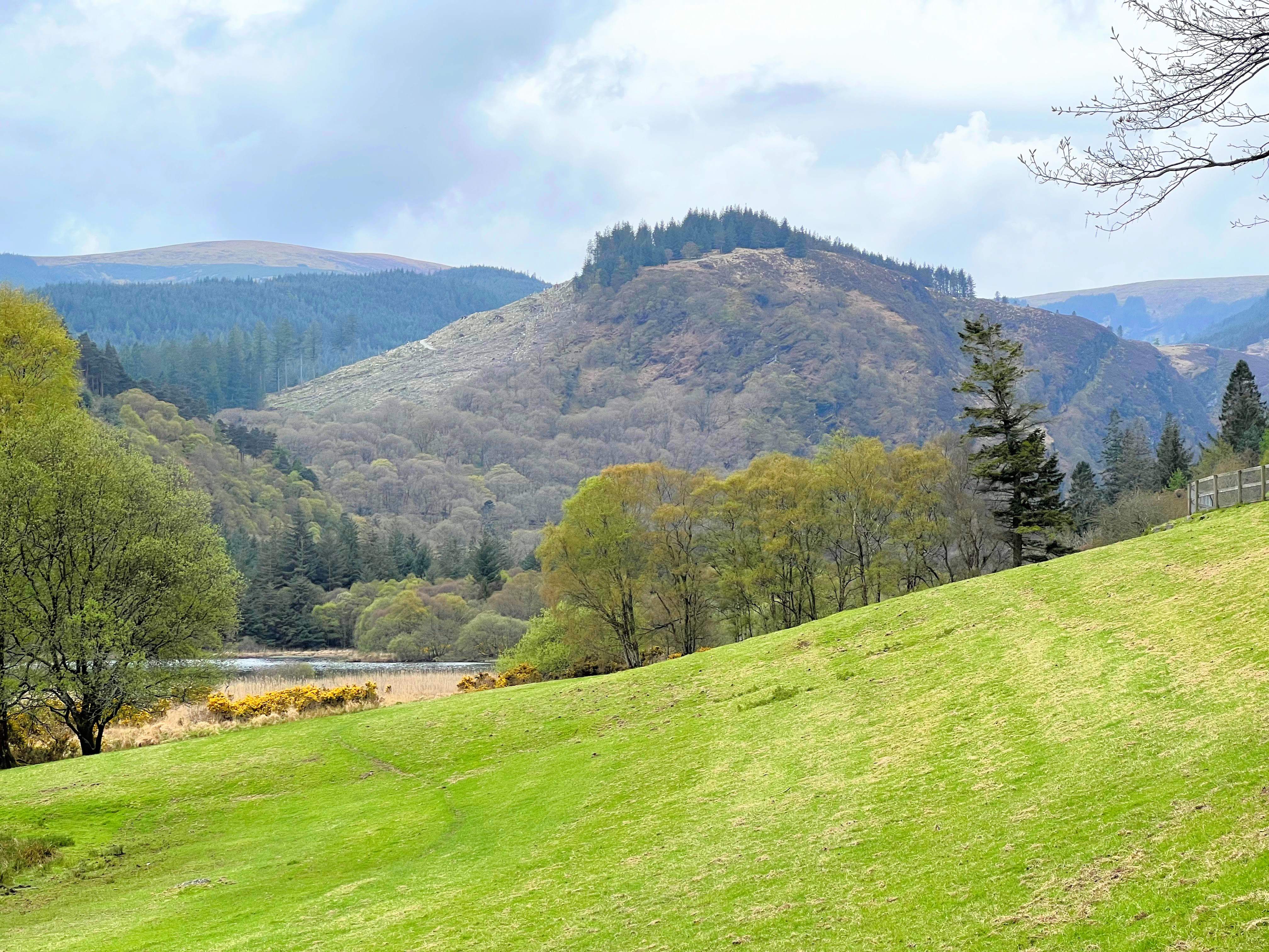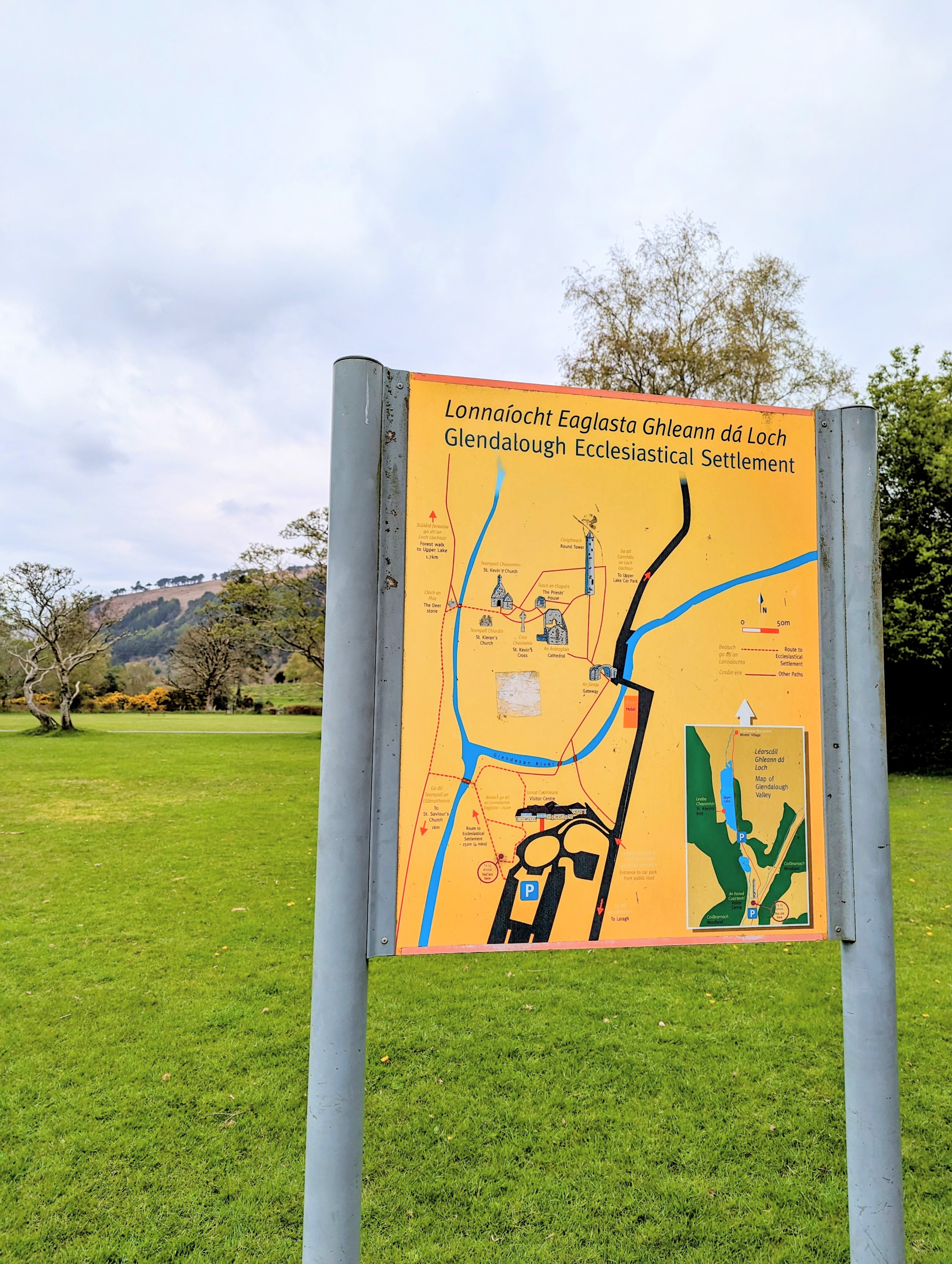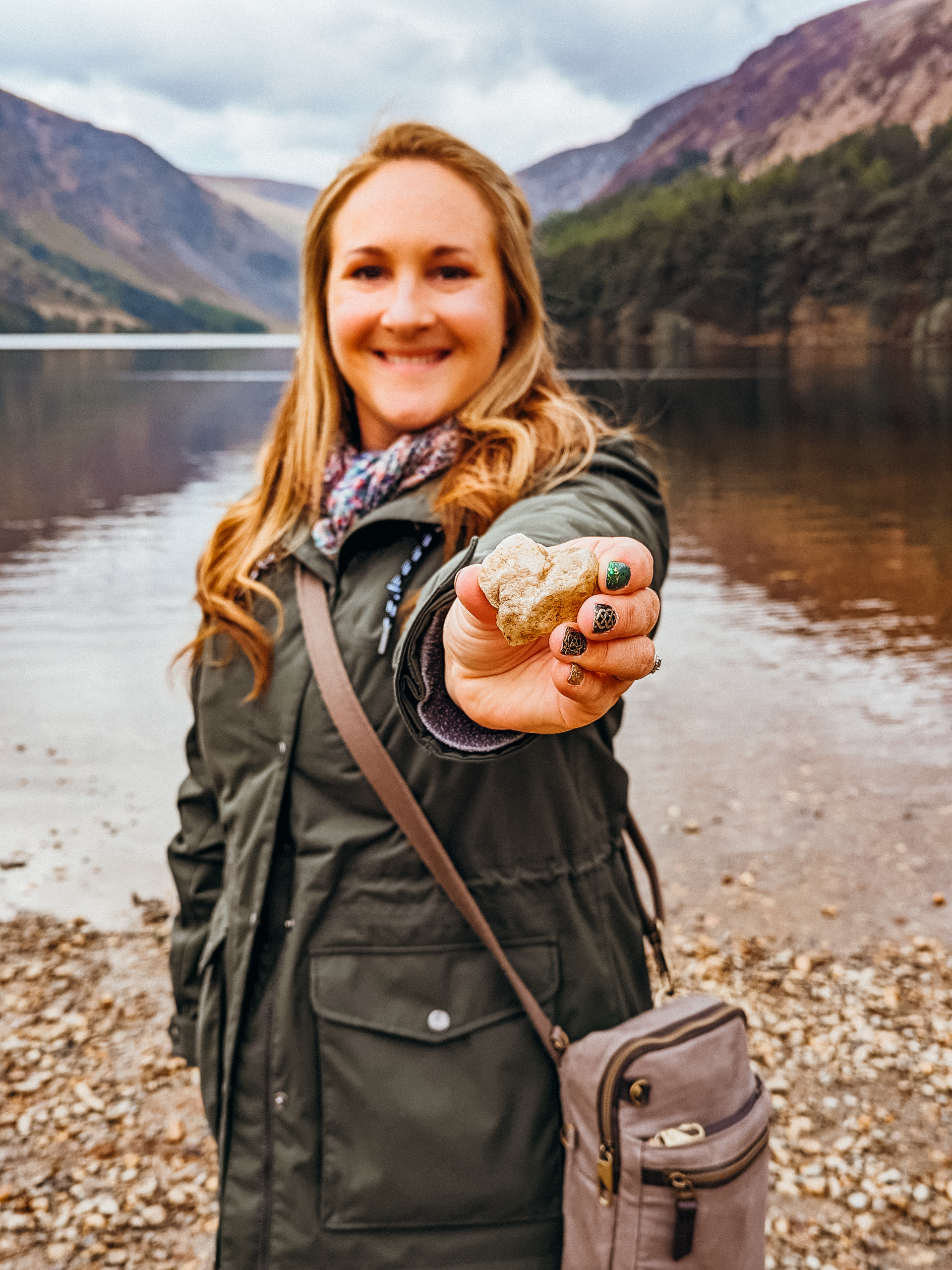 At the end of our tour we stopped in the gift shop and at the cafe for a quick bite before heading south to our next destination, the Monastic City of Glendalough (pronounced Glen-da-lock). It was a beautiful 40 minute drive through the Wicklow National Forest & national park on our way to Glendalough. Once we arrived we walked to the Monastic City, which are 9th & 10th century ruins consisting of a round tower, St. Kevins Chapel, St. Mary’s Church, the priest’s house, the cathedral and a cemetary. The city was built between the 10th and 12th century with several of the crosses in the cemetary dating to the 6th century. One of the guides told me that the intricate details carved into cross grave markers were added to share the salvation story with the Irish people who were mostly illiterate at the time. It was interesting to see all of the details that have stood the test of time and are still very present even after centuries of being exposed to the harsh elements of an Irish winter. The setting couldn’t have been lovelier for the Monastic city, nestled in the foothills of the Wicklow Mountains, between a babbling brook and the upper & lower Glendalough lakes. The view is straight out of a storybook, complete with woodland creatures and scenic views in every direction!