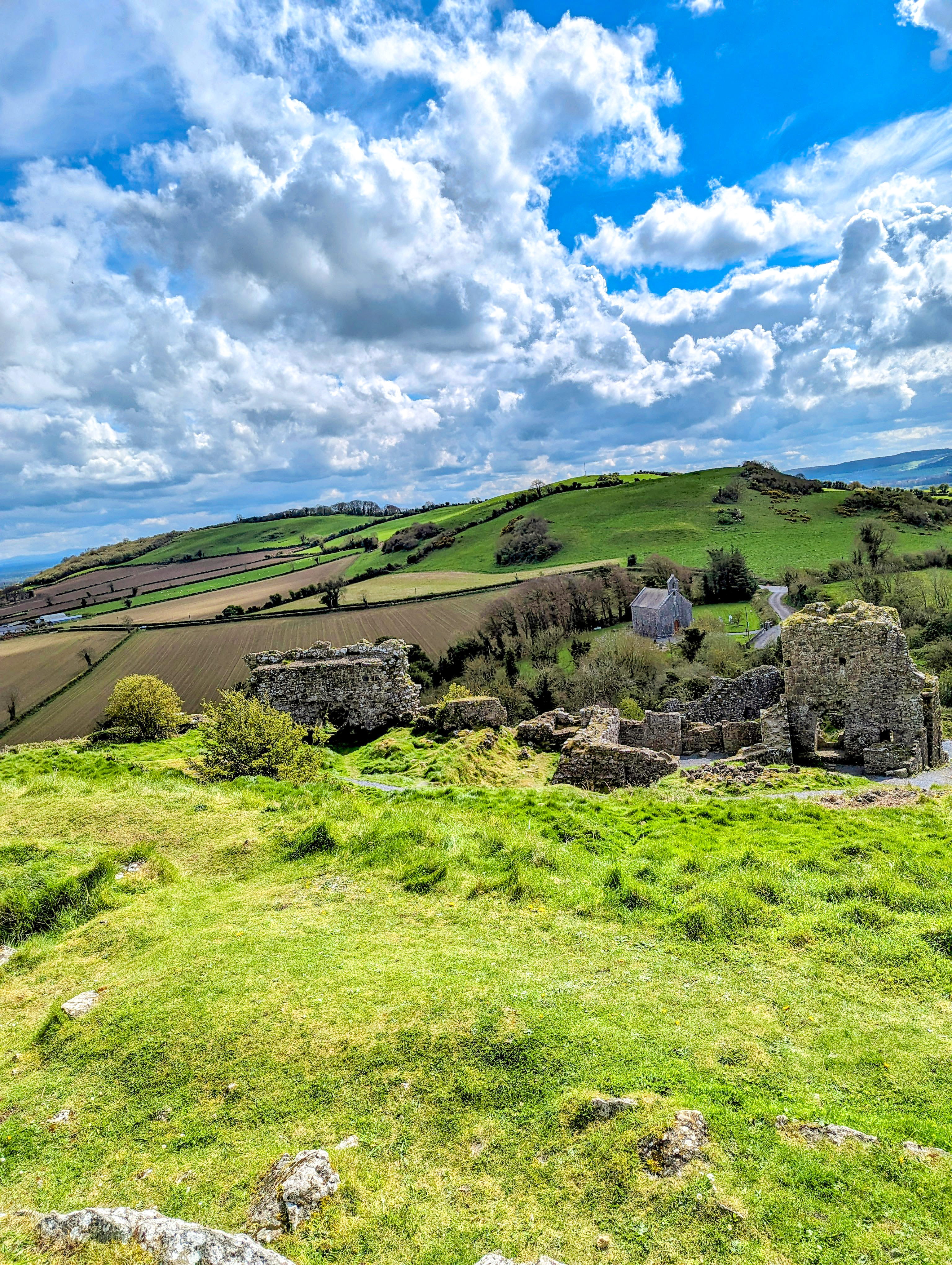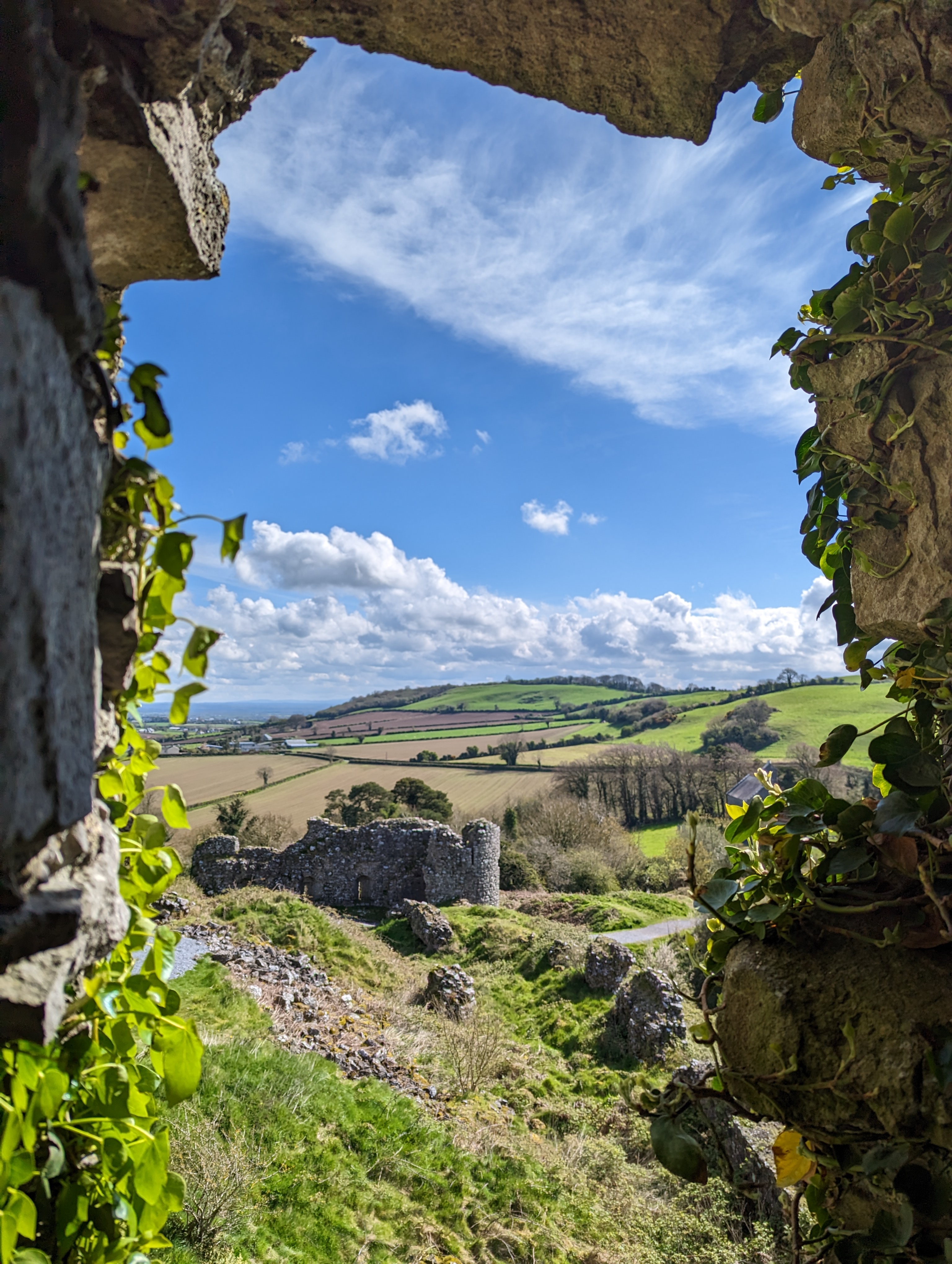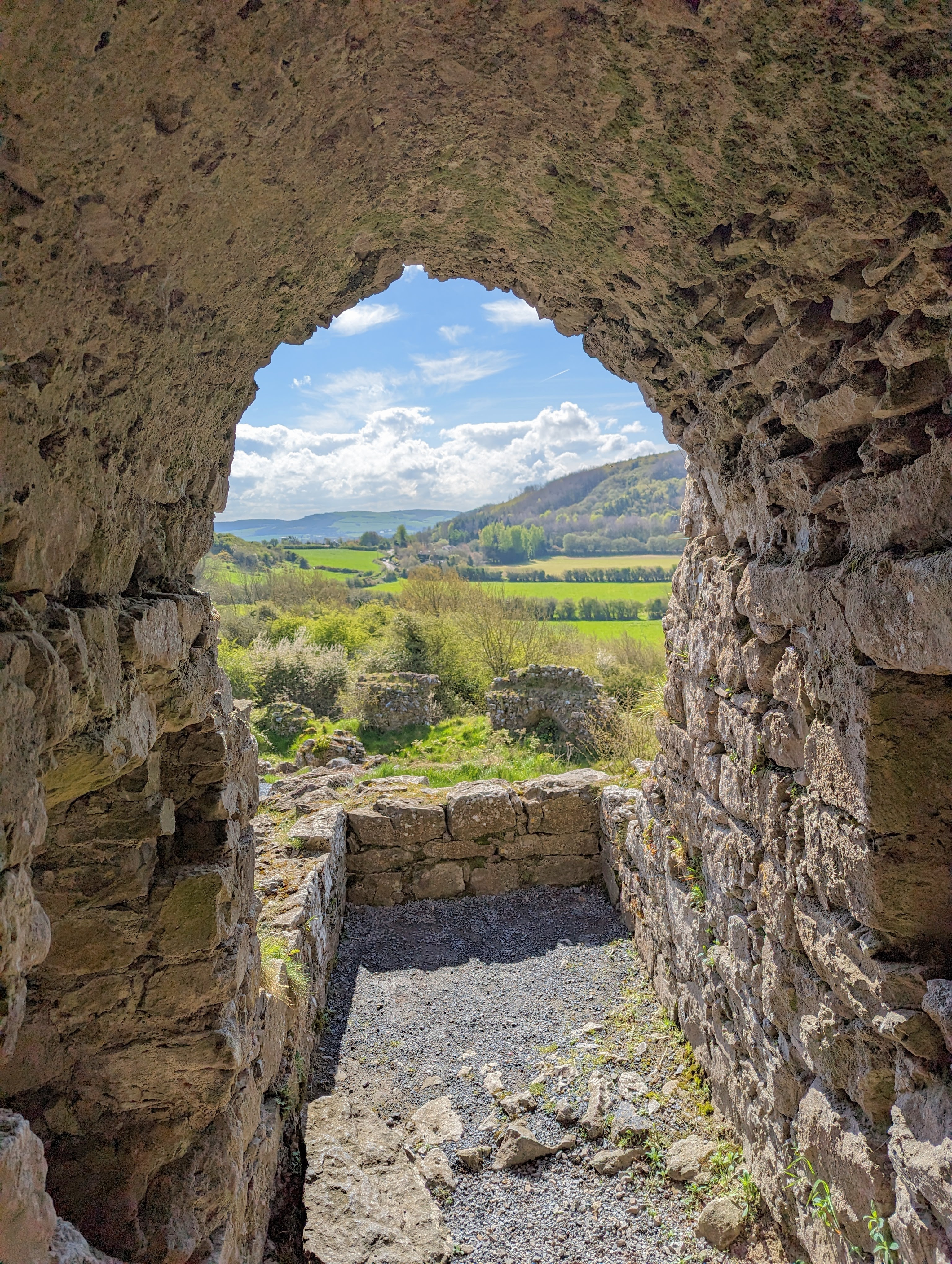 Dunamase is unique in that it is the ruins of a 12th century castle built on the site of a 9th century fort. It can be seen for miles as you approach by car. To enter the ruins you must walk through an outer barbican, the arched outer gate that leads to the inner triangular barbican, whose outer walls have multiple arrow loops embrasures under the wall walk. Above that is the main gatehouse and on top of the hill is the massive rectangular hall with a 2 storey solar that is thought to be of the late 12th century. Seeing these ruins and walking through them you can feel the history and picture what it would have looked like operating in full strength, in it’s time.