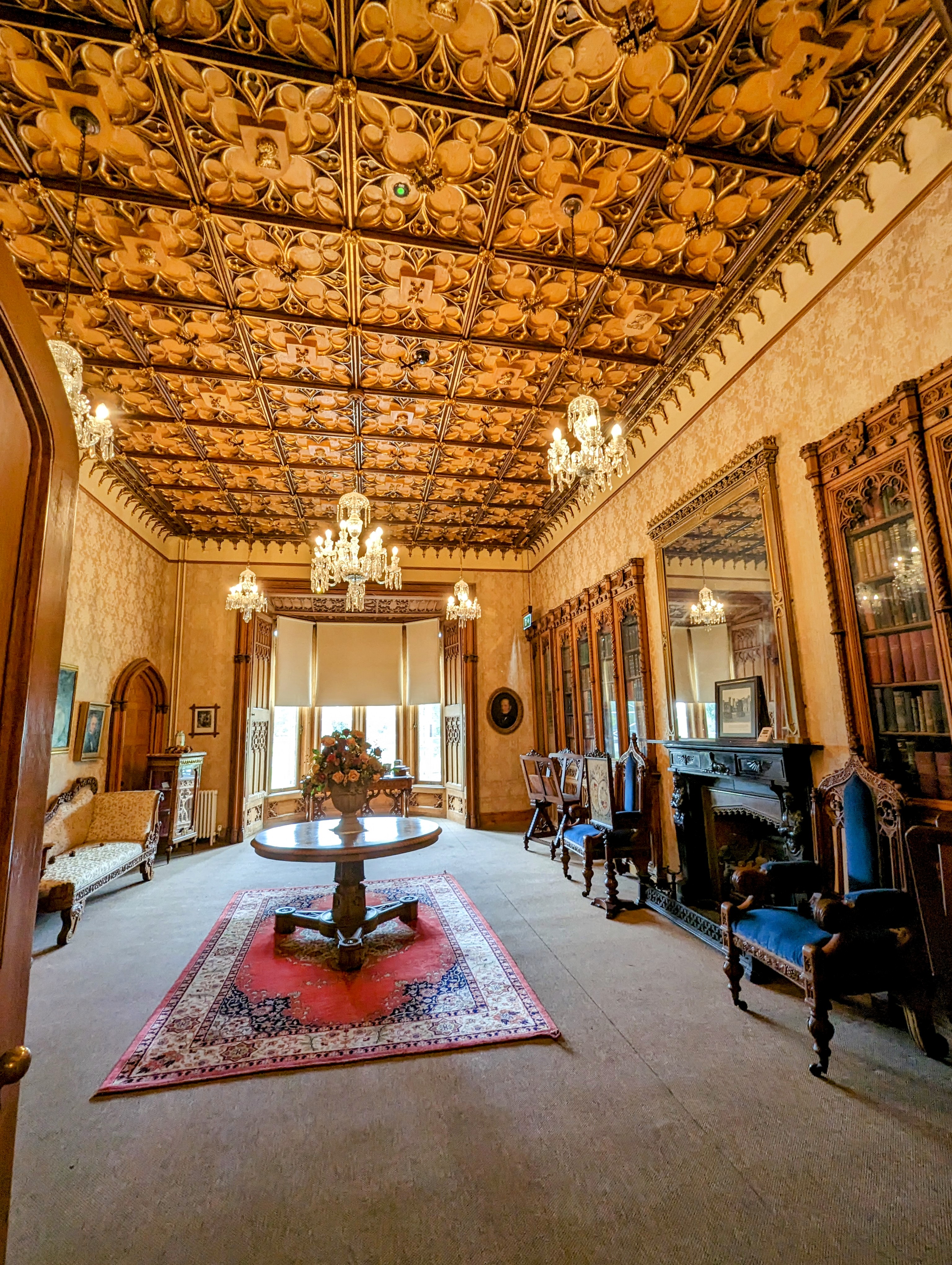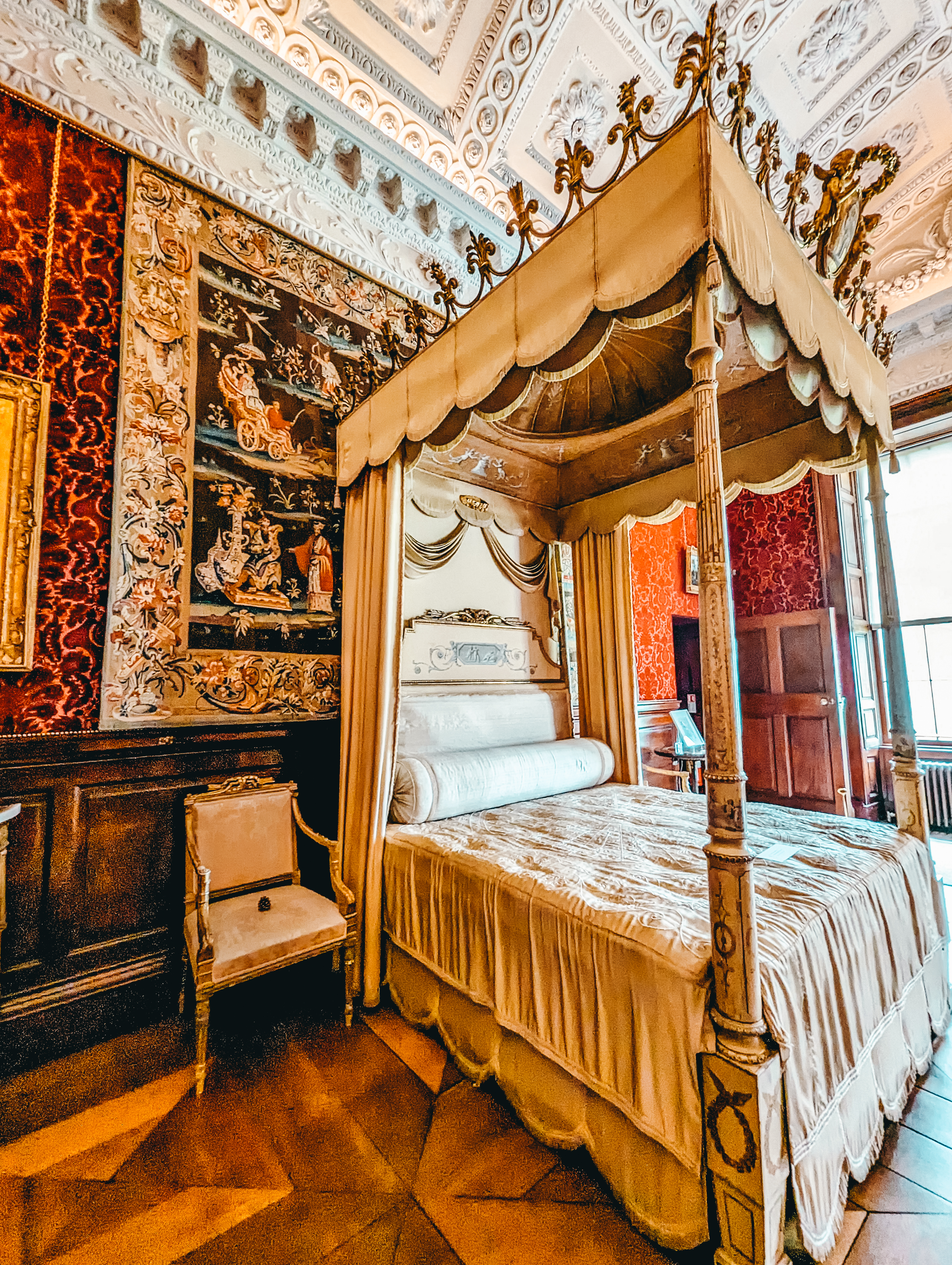 My favorite spaces were the large ballroom which is still covered with the original red velvet wallpaper and scuff marks on the wood floors from all the dancing that has taken place in the room. Another favorite was the library which can be reached by entering through a hidden jib door that looks like it’s part of the wall. The library is a cheery room with vibrant colors on the walls and carpet, walls lined with books and bookcase ladders, a large desk and globe and beautiful art. Some of the walls and ceilings were covered in a unique plaster details that I’ve never seen before.