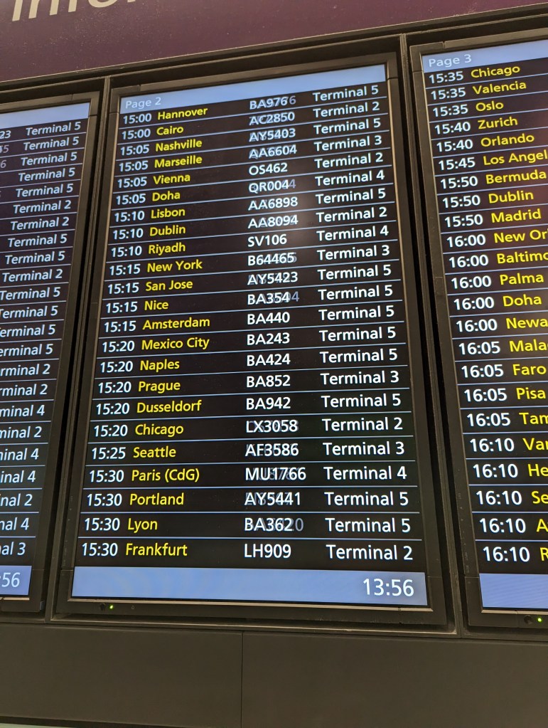 It was so much pressure with the airline staff constantly commenting that we would be out thousands if we missed the flight and repeatedly stated that it would be on our dime and not the airlines responsibility. Talk about a stressful situation! We were exhausted from running through the airport and rushing to reach the gate to try and hold it for the flight, we hadn’t had time to eat, drink any water or use a restroom in over 3 1/2 hours from before we had started our descent into London, deplaned, gotten through security and ran to our gate. Peach and I tried to quickly decide what to do and determined we would not leave her behind although the staff gave us 5 minutes to decide to board the plane or be stuck without a flight.