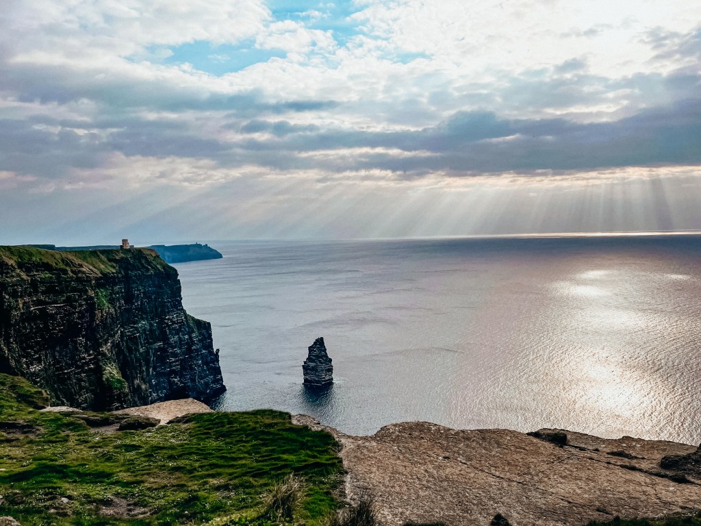 One of the first locations that I stumbled upon that kept coming up during my hours and hours of research was the iconic Cliffs of Moher. Yes, of course you can visit Ireland and skip a trip to the cliffs, but I recommend you add them to your list and trust me that they are “iconic” and listed as the number one tourist destination in Ireland for a reason! They sweeping views, rugged cliffs and breezy air tinged with salt are part of the Irish experience you really won’t want to miss! This view is really worth a visit, there’s nothing quite like the magic of looking out to sea while you watch the inch closer to the horizon, seabirds circle through the air and swoop next to the edge of the cliffs. We were met with breezy conditions and partially cloudy skies, but as we sat and soaked up the view the sun broke through the clouds revealing magnificent beams of light streaming across the sea. It was breathtaking to witness waves crashing against the majestic cliffs while we felt the warmth of the sun on our face and watched dandelions swaying in the breeze. We skipped the crowds by arriving at 4:30pm, about an hour before the visitor center closed. By arriving towards the end of the day we were able to enjoy the magic of the area with only seeing a handful of other people the entire 2+ hours we were there!