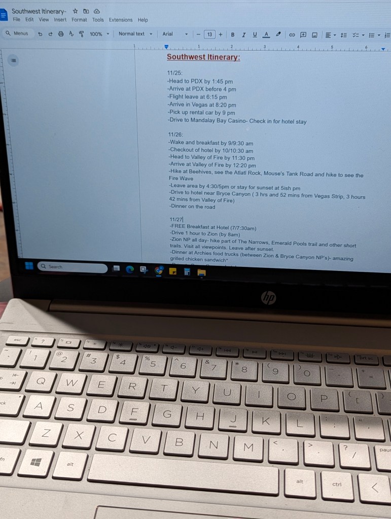 For our southwest road trip I spent approximately 2 & 1/2-3 months collecting information, reading travel blogs, travel guides, websites, Pinterest searches and watching specific southwest related youtube videos. From those I collected information, gained insights and tips that were included in our itinerary. With the research and wealth of information I gathered I made notes of: the name of hikes, specific destinations and restaurant recommendations, epic viewpoints etc. so I was able to look them up later. A lot of the information I gained was from reading. As I’m reading about a destination I like to take snapshots/snippits of that information and add it into Google docs with a pic of the destination/location or activity as well (a visual really helps with my frame of reference when looking through the doc later on & while on our trip). I’ll also star or asterisk locations and highlight them so we know they’re important to us & reminders not to skip them. Doing this has been one of the best ways to ensure we visit the destinations that are priorities to our group. I also recommend making an excell spreadsheet of all the destinations and breaking the blocks into time chunks, but I recommend doing what feels the most useful for you and your family.