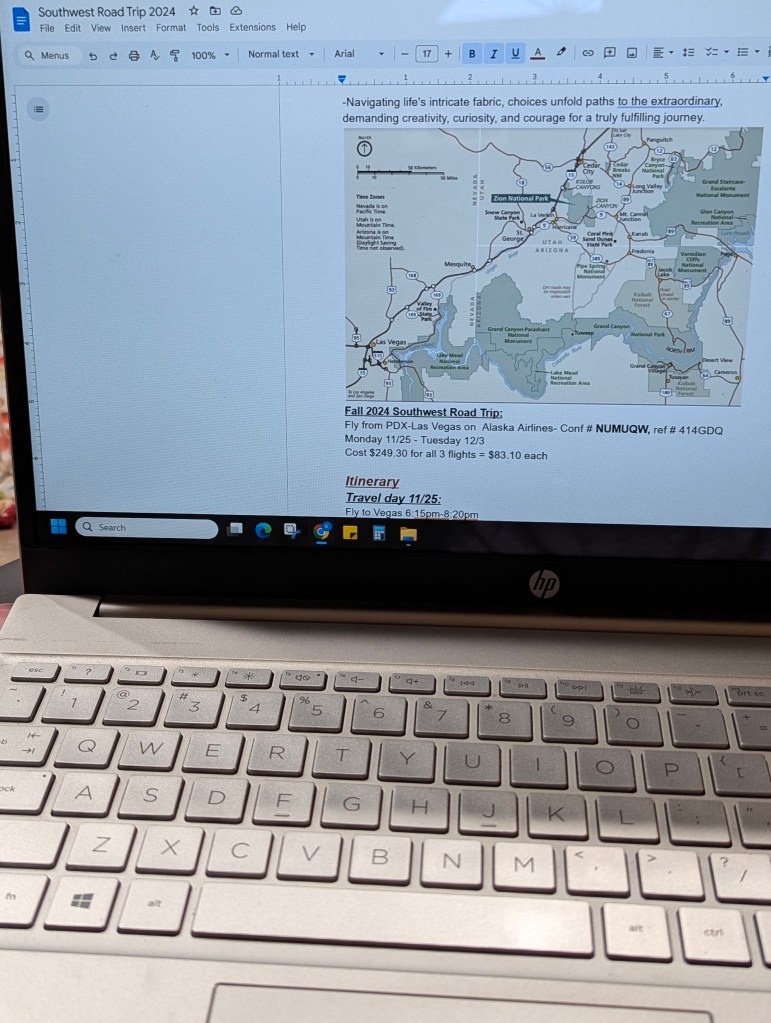 After I add information to the Google Doc I go through it and type each location into Google Maps in order to map out the order in which to visit each place. A great benefit of doing this is that I’m able to determine the distance between locations & if something is too far out of the way I can easily make adjustments to the itinerary as needed. This also allows us to maneauver our days/trip in order to accomodate specific sights or make allowances in our time as needed and whittle things off the list as well. Another thing I like to do is spend some time zooming in on Google Maps to the areas we’ll be visiting. This helps me see the sights that “Maps” highlights in those areas. I’ve found a lot of hidden gems this way. I also like to head to websites dedicated to areas we’ll be visiting such as the National Parks website (one of our best resources for this trip since we were planning to visit 5 of them) to update my information if trails are closed, find useful insights and printable maps of the locations we plan to visit.