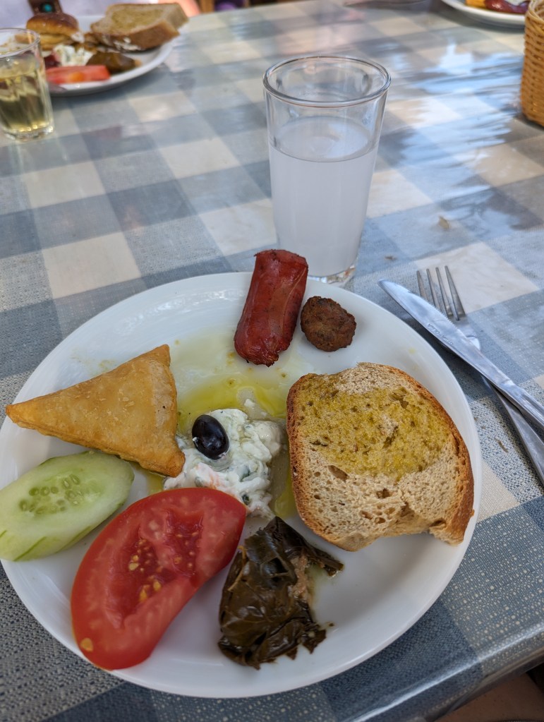 We feasted on authentic Greek meze — everything from tzatziki and vine leaves to cheese pie, grilled sausage, tomato, cucumber, and crusty bread. Each bite tasted like summer.