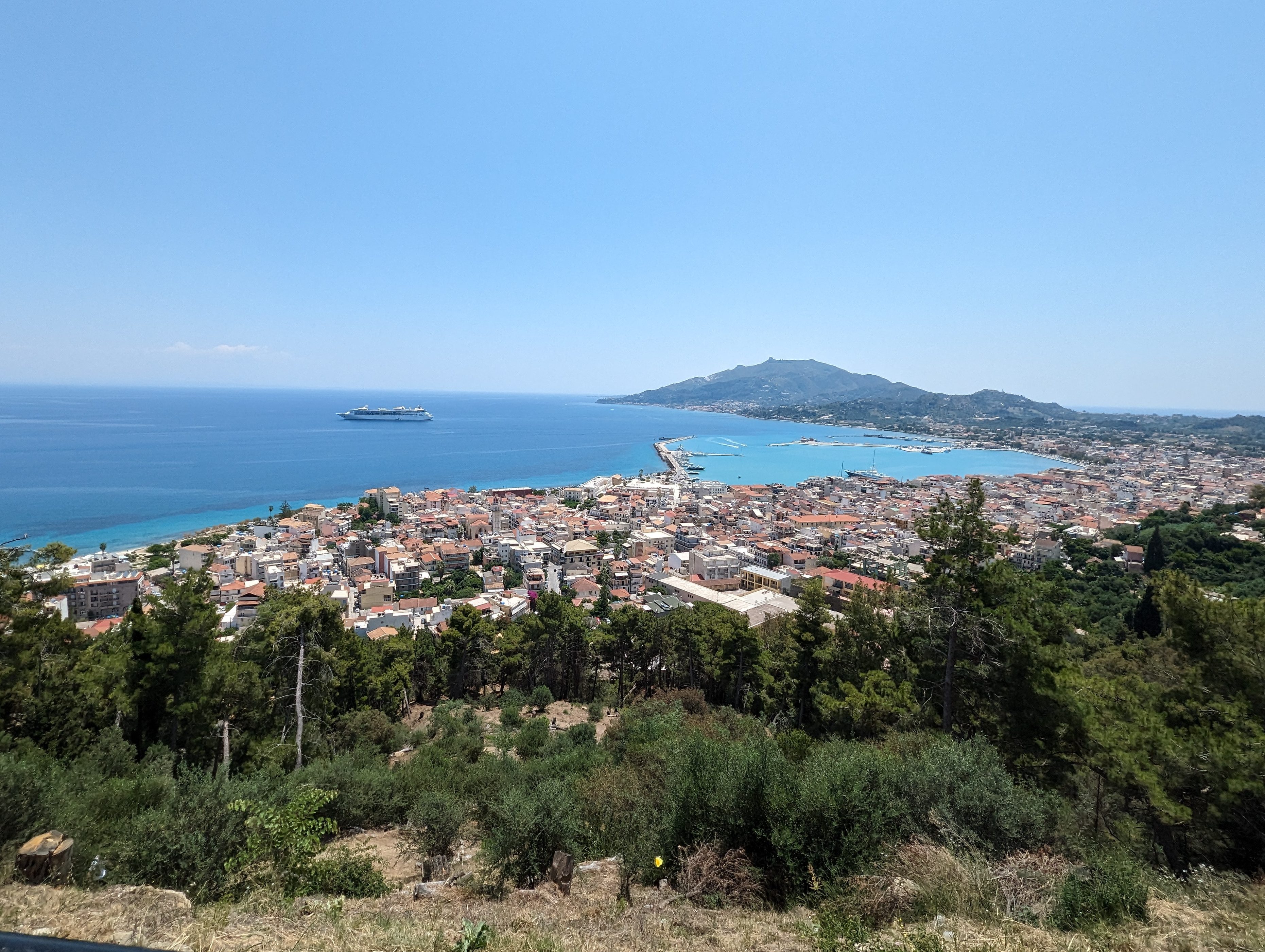 Our final scenic stop before heading back to the ship was the panoramic viewpoint at Bohali, perched above the island’s main harbor. From here, we could see all of Zakynthos Town, the docked ships, and far across the sea to the island of Kefalonia shimmering in the afternoon sun.