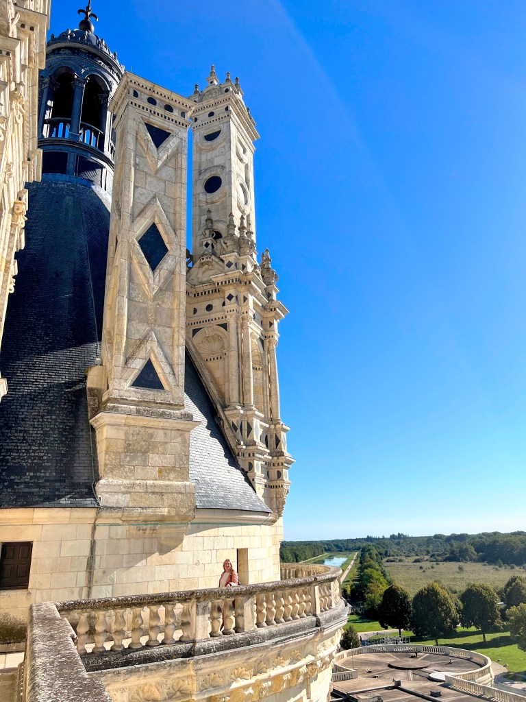 Climbing up to the rooftop terrace left us speechless. Ornate towers, spires, and chimneys rose around us like stone lacework, while the morning sun cast long shadows across the lawns and gardens. Chambord wasn’t just a château—it was an entire world of splendor.