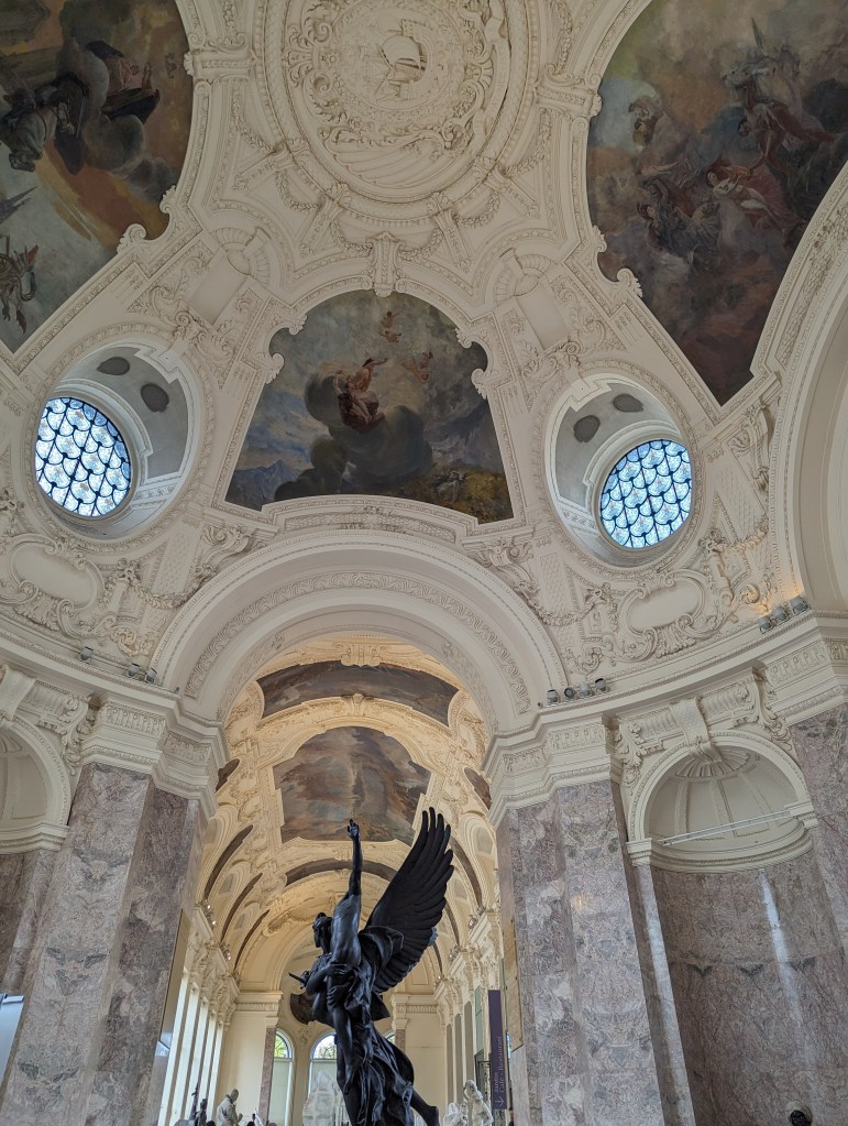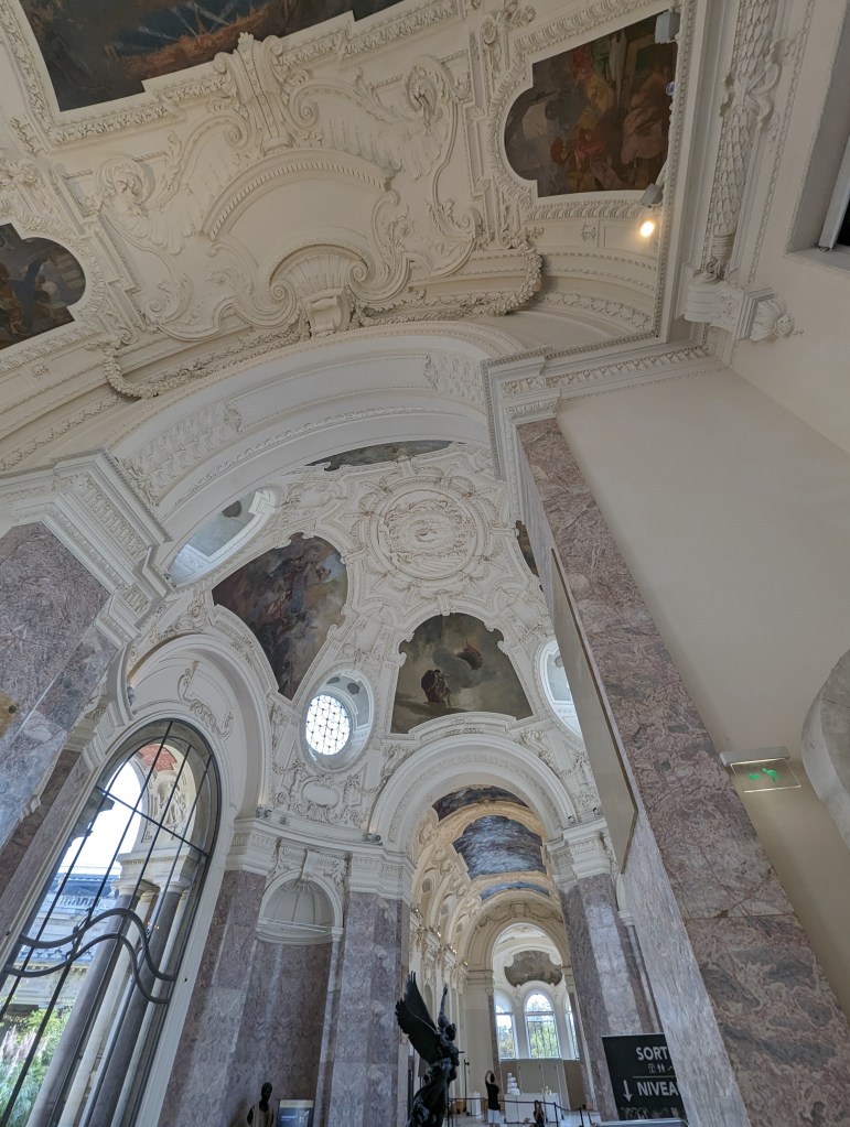 Our next stop was the Petit Palais, a true Parisian gem. Lesser-known and blissfully free of crowds, it felt like a secret waiting to be discovered. The building’s Beaux-Arts architecture is magnificent, with painted ceilings, marble staircases, and ornate details at every turn. We loved wandering through its serene courtyard garden, a peaceful oasis surrounded by art and elegance. It’s one of those places that captures the essence of Paris without the bustle — refined, beautiful, and quietly enchanting.