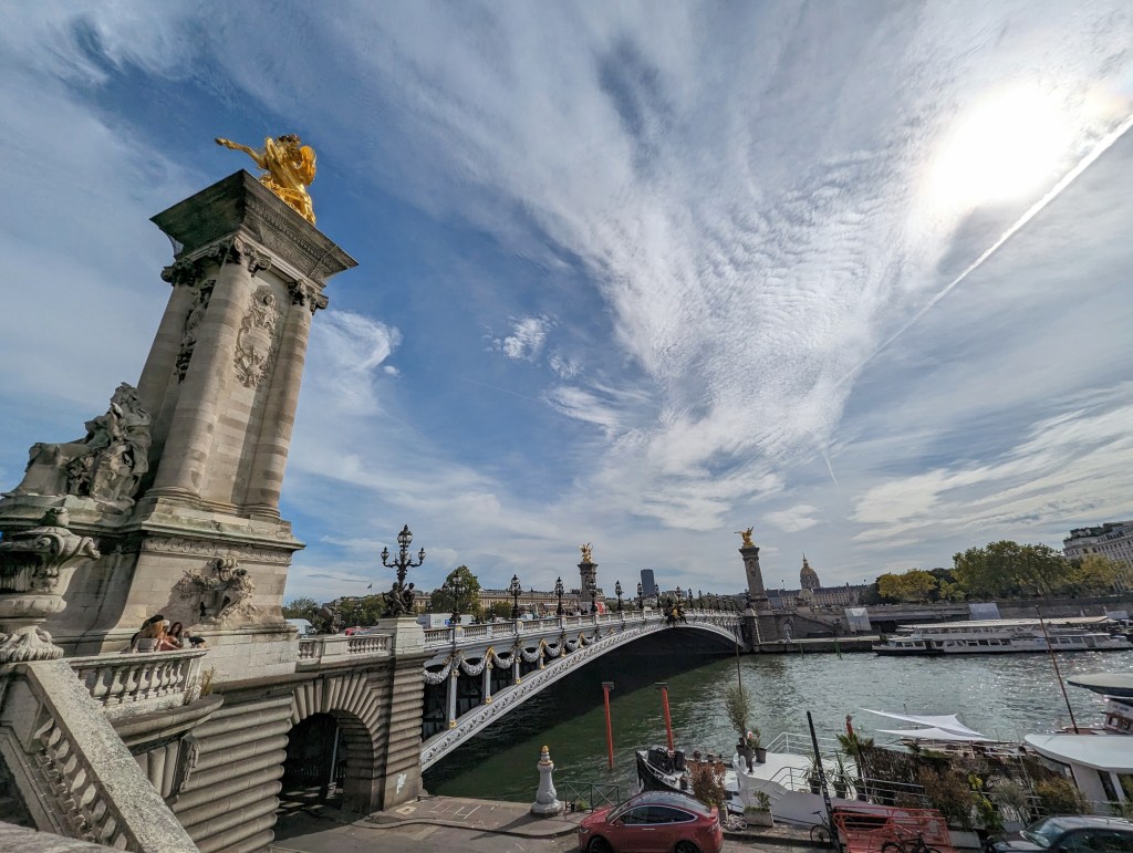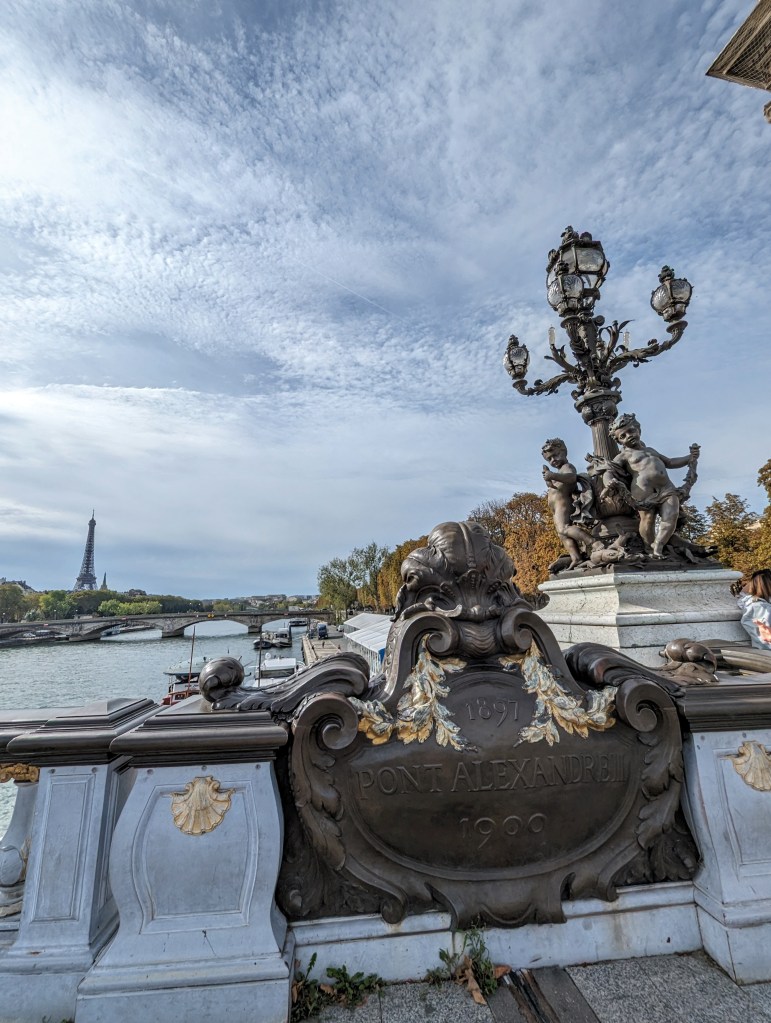 After leaving the Petit Palais, we strolled across the Pont Alexandre III Bridge, one of the most stunning in Paris. Its golden statues glistened in the late afternoon sun, and from its span, we had postcard-perfect views of the Seine and the Eiffel Tower in the distance. The air was soft and golden, the river below rippling like liquid light — the kind of scene that makes you pause and realize just how extraordinary this city truly is.