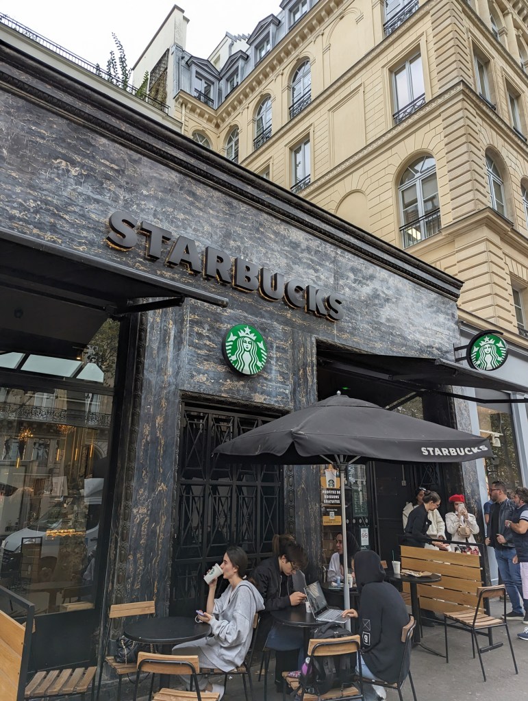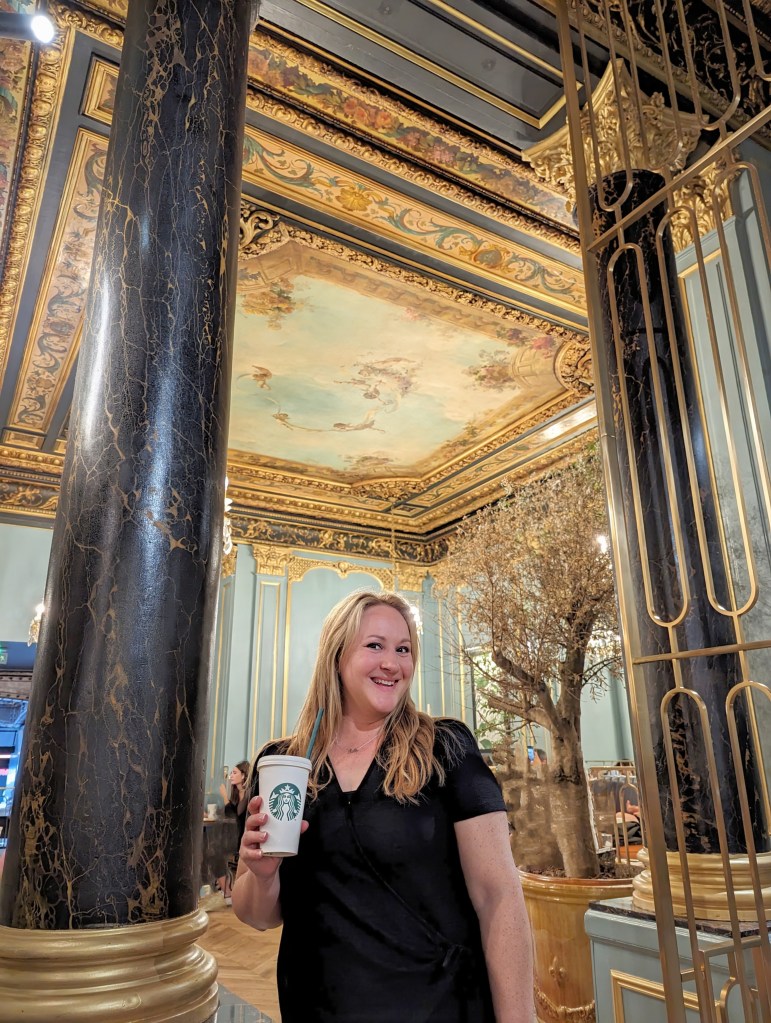 A short stroll away, we found ourselves in what might just be the most elegant Starbucks on Earth. Forget your usual corner coffee shop — this one gleamed with chandeliers, gold trim, and plush velvet seating.