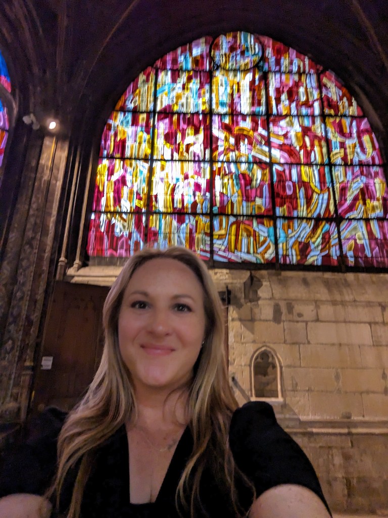 The moment we stepped inside, every breath caught in our throats. Light streamed through 15 towering stained glass windows, each panel depicting intricate biblical scenes in vibrant blues, reds, and golds.